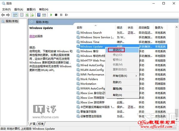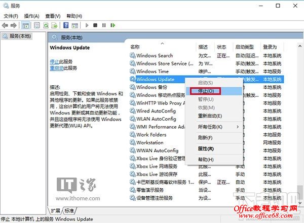 2、找到Windows Update服务,并将其停止(可在服务名称上点右键,选择“停止”;或点击左侧的“停止此服务”)