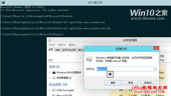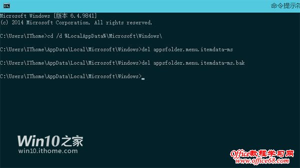 4、 现在,大家可以看到整个资源管理器都退出了,仅留下了我们刚刚打开的“命令提示符”窗口。不用担心,资源管理器一会儿就会回来。现在我们需要在“命令提示 符中”输入两行命令,删除掉之前Windows自动生成的配置文件。Win10命令提示符支持粘贴复制,因此朋友们直接复制然后粘贴过去就好。粘贴完其中 一行后,记得要按“回车”键,没有任何提示,继续下一行就好。 del appsfolder.menu.itemdata-ms del appsfolder.menu.itemdata-ms.bak