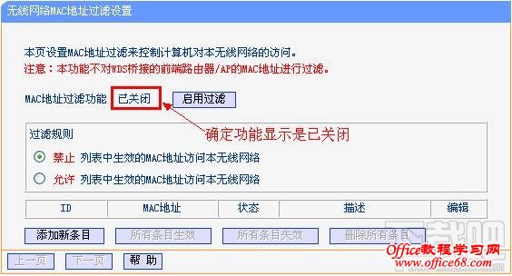 四、关闭无线MAC地址过滤路由器上开启了无线MAC地址过滤,规则设置不当也会引起无线连接不成功,建议暂不启用该功能。 设置方法:通过有线电脑连接并登录路由器管理面,点击 无线设置>>无线MAC地址过滤 关闭无线MAC地址过滤功能。如下图所示: