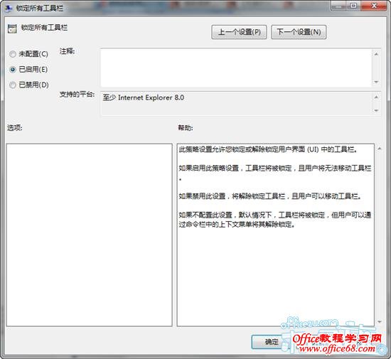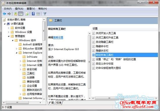 1 运行组策略编辑,依次进入“计算机配置”→“管理模块”→“Windows组建”→“Internet Explorer”→“工具栏”,双击右侧窗口中的“锁定所有工具栏”。