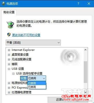 3、展开USB设置—USB选择性暂停设置,将其设置为“已禁用”,确定。
