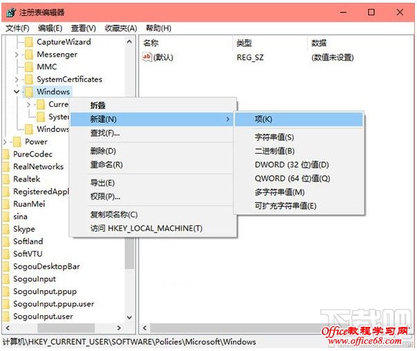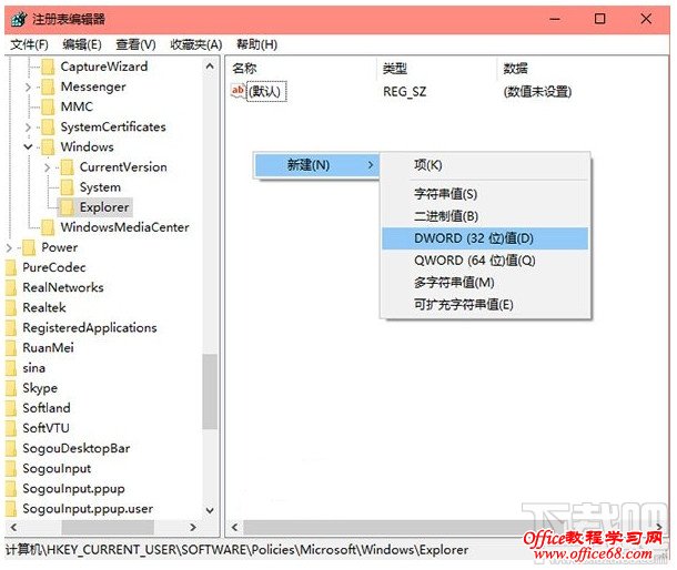 注意,若没有“Explorer”项,可自己新建一个(在Windows文件夹上点右键,选择新建→项,如下图)