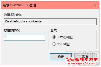 4、双击DisableNotificationCenter,将数值数据改为 1,点击“确定”,如图。