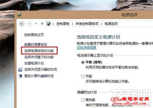 3、点击左侧的“选择电源按钮的功能”选项后就会进入设置页面,在窗口界面底部可以看到“关机设置”,在这里您可以设置快速启动,但是界面中显示的为灰色字体不可改动,没关系,看下面吧;