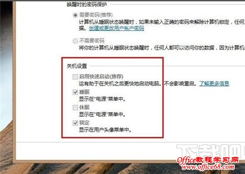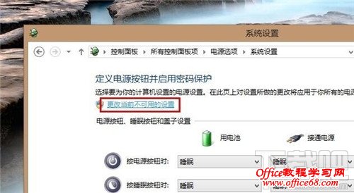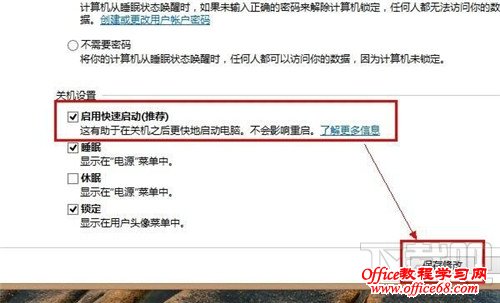 4、在界面 顶部点击“更改当前不可用的设置”选项,看看下面的“关机设置”是不是可以设置了!勾选“启用快速启动”复选框按钮,然后点击“保存修改”按钮即可开启快速启动功能;