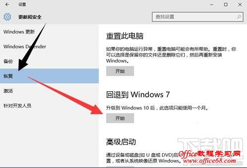 3、在【系统更新和恢复】属性窗口点击左边的【恢复】,然后在恢复选项里找到【回退到Windows7】,在升级WIN10的一个月内支持任性系统回退;