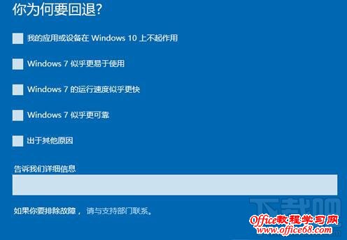 4、在执行系统回退之前会做一些简单的配置,也就几秒钟时间,然后弹出一个表单让你选择为什么要回退到老版本WIN7系统;