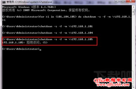4、批处理依次从101强制关到105,在返回的信息中看到有一部电脑“拒绝访问”,这样要在这部电脑组策略里设置一下允许远程强制关机就可实现远程关机了,这个不在本篇叙述之列,我的经验里有“怎样在win7下强制远程关机”这一篇,敬请参阅。