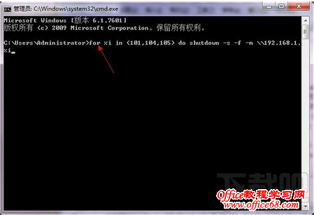 3、再针对没关闭电脑输入批处理强制关机命令for %i in (101,104,105) do shutdown Cs Cf Cm 192.168.1.%i回车