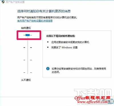 3、在用户帐户控制设置窗口,我们可以看到调整通知的小滑块处于“始终通知”位置;