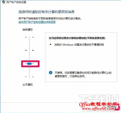4、再把小滑块拖到如下图位置:仅当应用尝试更改我的计算机时通知我(不降低桌面亮度)- 当我对Windows设置进行更改时不要通知我,再点击确定;
