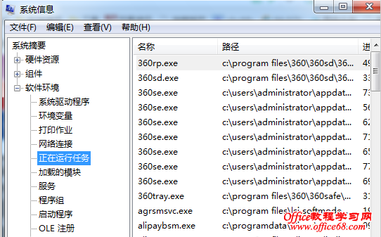 2、随后会弹出一个系统信息窗口,我们依次展开“系统摘要—软件环境—正在运行任务” ,便可以在右边框中看到系统中正在运行的所有程序的信息,包括优先顺序、最小工作集等等。