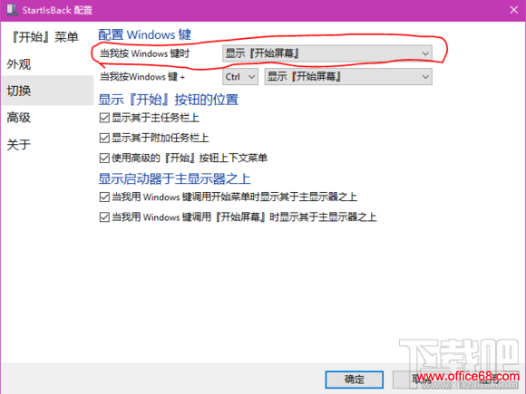 4)选择“切换”,在“配置windows建”下“当我按windows建时”选择“显示开始屏幕”