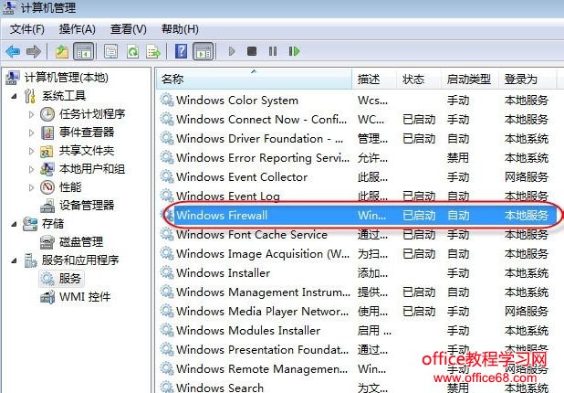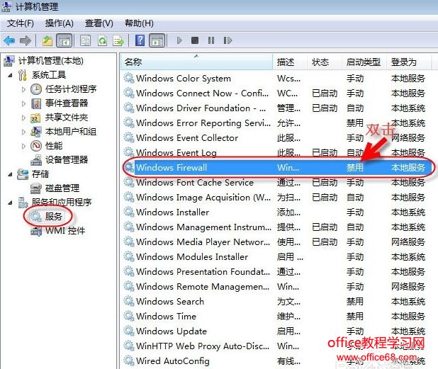 找到“Windows Firewall”的服务项,然后可以看到这些所谓的精简版是禁用了防火墙的。双击这个条目。