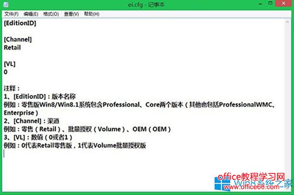 注释: 1、[EditionID]:版本名称 例如:零售版Win8/Win8.1系统包含Professional、Core两个版本(其他也包括ProfessionalWMC、Enterprise) 2、[Channel]:渠道, 例如:零售(Retail)、批量授权(Volume)、OEM(OEM) 3、[VL]:是否为批量版,可选数值0或者1) 例如:0代表Retail零售版,1代表Volume批量授权版 例如,普通用户下载零售版Win8/Win8.1 MSDN系统,可依次输入如下命令: [EditionID] [Channel] Retail [VL] 0 4、然后将该ei.cfg文件拷贝至U盘启动盘X:\sources目录(X:代表U盘盘符)