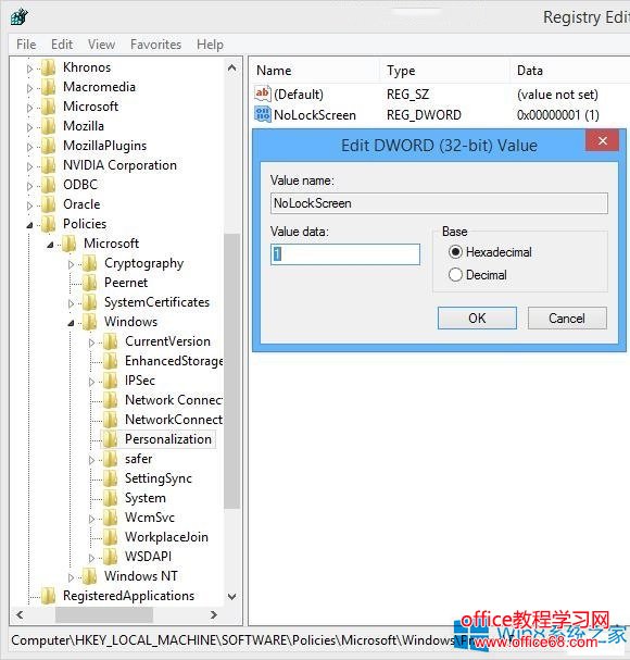 3、最后右键点击Windows文件夹,选择“新建”-“项”(Key),命名为Personalization,选定。选择Personalization条目后,在窗口右侧右键点击,创建一个新的DWORD (32-bit value)(PC841.COM教程)注册表条目,然后命名为NoLockScreen,双击该条目,然后将其值从0更改为1即可。 4、以上步骤完成后,关闭注册表编辑器,然后重启电脑即可完成关闭Win8.1锁屏。 |