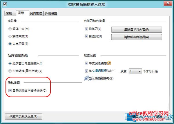 2、在隐私设置选项下去掉“自动记录文字转换错误”前面的勾;