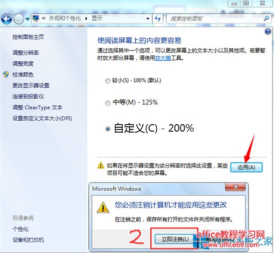 5、 回到“显示”页面,我们先点击“应用”,接着桌面会出现一个弹窗,我们需要点击“立即注销”即可。