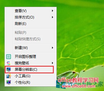 1、首先在win8系统桌面上的空白处,点击鼠标右键,在弹出的菜单栏中选择“屏幕分辨率”选项;
