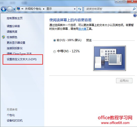 3、 在“显示“窗口下,找到并单击屏幕右侧“设置自定义文本大小”选项;