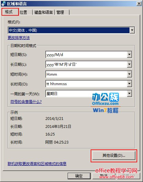 ![]() 选择更改时间格式 4 此时会弹出一个“区域和语言”对话框,我们选择“格式”选项卡,并单击右下方的“其他设置”按钮。