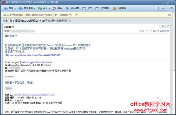 电脑每隔一段时间卡顿一次,现象是硬盘灯全亮,鼠标可以运动但无法点击,其他操作全部停滞。如果提前打开任务管理器会发现此时的磁盘占用率静止在50% ,等上一段时间后系统又会恢复,停滞期间所有暂停的操作都会在恢复的一瞬间全部弹出,整台电脑完全没办法使用。 浏览该款 SSD(Maxell N5000系列)厂商主页发现了两个完全没有说明的固件链接,两个固件的版本号竟然不是连续的(1.9、7.9)把问题写成邮件告诉厂家客服,两天后客服的回复过来了,让我检查一下是否开启了 AHCI 以及 Event LOG 中是否有 error ID:129 的记录,如果有那么微软已经提供了相应解决方案通过修改注册表即可解决。