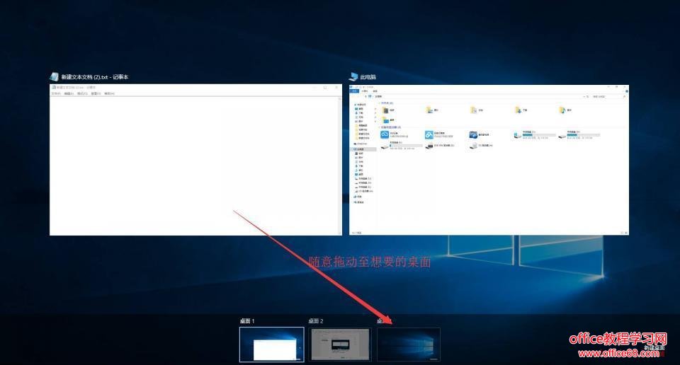 可以看到,底部显示了现有的虚拟桌面,可以在此处选择需要进入的桌面。屏幕中间会显示所有正在当前桌面运行的程序。而右下角则有一个新建桌面的按钮,可以根据自己的需求来新建桌面。 在此状态下,可以随意拖动当前打开的程序到任意虚拟桌面处: