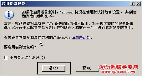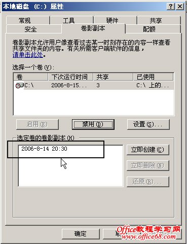 点击:“是”确认,这时候就启用了卷影副本。在启用了卷影副本功能后,系统就为我们创建了第一个卷影副本,如图3: