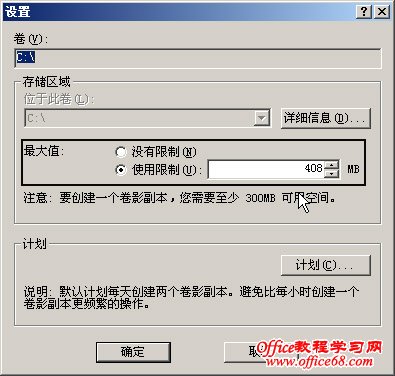 创建卷影副本要占用一定的磁盘空间,我们可以通过“设置”来调整存储限制和生成卷影副本的时间计划,单击设置按钮进入设置窗口,如图4: