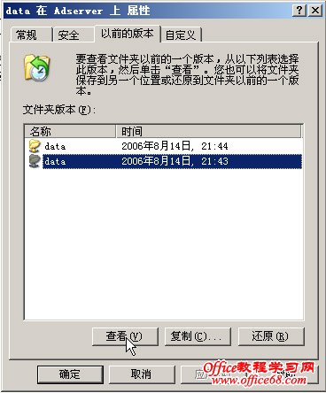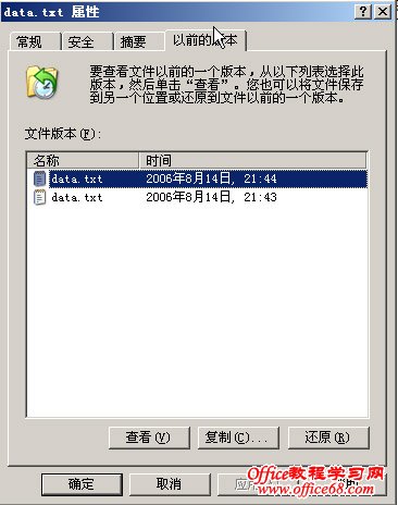 在下面的列表中有卷影副本,选择一个卷影副本,我们可以选择“还原”按钮来还原整个文件夹,也可以通过“查看”按钮,来还原这个文件夹下的所指定的文件,这里我们单击“查看”按钮,然后就可以看到卷影副本里面的文本文件data.txt,如图13: