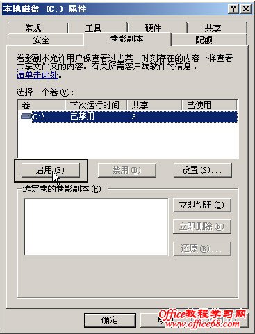 如我们要在服务器的C盘下启用卷影副本,我们就右击C盘,出现的菜单中点击“属性”,在出现的属性窗口中点击“卷影副本”选项卡,在选择一个卷中,我们选中C这个分区,再单击“启用”按钮,如图1: