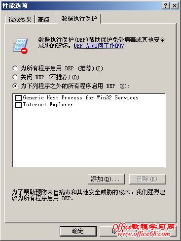 针对某些程序关闭DEP保护,只需要点击上图中的“为下列程序之外的所有程序启动DEP”,然后点击添加按钮,找到您所信任的程序执行文件,添加即可,然后重启计算机即可生效。 第二种方法,全部关闭DEP保护功能,可以在上图中,点击关闭DEP(不推荐),然后重新启动计算机即可。也可以通过直接修改Boot.ini文件达到彻底关闭数据执行保护的目的,在 WinXP SP2/SP3系统目录下找到Boot.ini文件。有这么一行(其他驱动器类似): ......="Microsoft Windows XP Professional"=OPTIN /FASTDETECT /USEPMTIMER /noexecute 修改NoExecute参数为NoExecute=AlwaysOff,然后保存即可,相当关闭DEP功能和EVP和EDB。实际上,在上述第一种方法中如何修改关闭DEP选项,系统会自动修改boot.ini文件的启动项,实现结果相同。 二、Windows Vista下开始/关闭数据执行保护(DEP)的方法 在Vista下关闭DEP方法也很简单,只需要按照以下步骤操作即可: 1、新建一个文本文件mod.txt,然后输入: bcdedit.exe/set {current} nx AlwaysOff pause 2、保存后,再重命名为bat文件mod.bat; 3、然后在文件上鼠标右键以管理员身份运行即可,看到运行结果。 4、关闭该命令运行窗口,然后重新启动计算机即可生效 另外,对于没有管理员权限的用户执行修改DEP数据保护设置可能会出现下图提示: