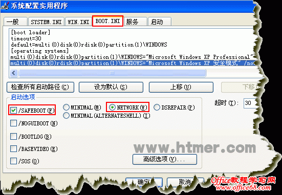 3、开始→运行→输入msconfig,单击“确定”打开“系统配置实用程序”对话框,在“BOOT.INI”选项卡下单击“multi(0)disk(0)rdisk(0)partition(1)\WINDOWS="Microsoft Windows XP 安全模式" /noexecute=optin /fastdetect”行(也就是我们前面利用记事本打开boot.ini文件时复制、粘贴并修改的那一行。),然后在其下边的“启动选项”中勾选上“/SAFEBOOT(F)”项,也可以再选择后边的NETWORK(意思是带网络连接的安全模式)。(如图3)