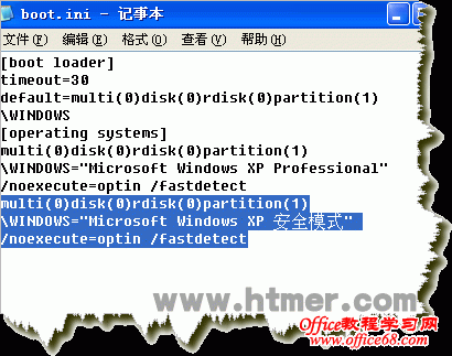 2、在打开的“启动和故障恢复”对话框中单击“系统启动”项中的“编辑”按钮,这时会用记事本打开boot.ini文件,我们将文件中的“multi(0)disk(0)rdisk(0)partition(1)\WINDOWS="Microsoft Windows XP Professional" /noexecute=optin /fastdetect”这行内容在其下边再复制粘贴出一行,再将粘贴出的这行中的Professional改为“安全模式”,保存后关闭记事本窗口。(如图2)