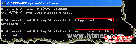 方法四(只适用于Windows 2000/XP): ①找到C:\WINDOWS\system32\cmd.exe文件,将其重命名为cmd.com或cmd.scr ②开始→运行→输入cmd,打开命令提示符窗口,分别输入两个命令(每输入一个命令后回车):ftype exefile=%1 %*和assoc .exe=exefile ③将刚刚改名的cmd.com或cmd.scr再改回cmd.exe即可,相关截图如下所示: