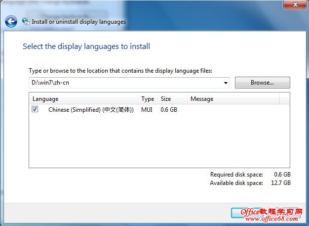 4、下面我们开始选择安装语言包的位置,文本框里头直接输入语言包地址或点Browse浏览查找,Windows 7会自动查找对应目录下的语言包个数和类型,选中需要安装的语言包核选框,然后点Next。