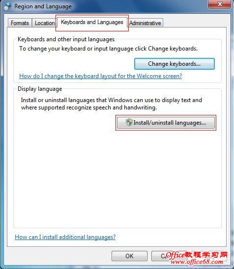 下面演示Windows 7语言包安装过程:天缘实测安装是35种多国语言的安装包7600.16385.090713-1255_x86fre_client_langpacks_1-GRMCLP1_DVD.iso,下载完成后,用WINRAR或UltraISO打开皆可,然后把里面的zh-cn目录下文件lp.cab(每种语言都是一个文件包)拷贝到Windows 7的某个驱动器目录下,比如D:\win7zh-cn下。 1、打开控制面板Region andl language选项,选中Keyboards and Languages选项卡,点击Install/Uninstall languages...,下图示: