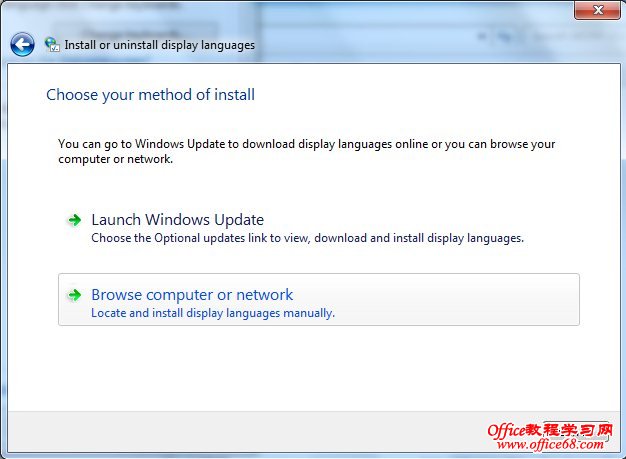 3、弹出选择语言包的安装方式对话框,天缘使用的是自己的下载语言包,所以选中下面的Brower computer or network。