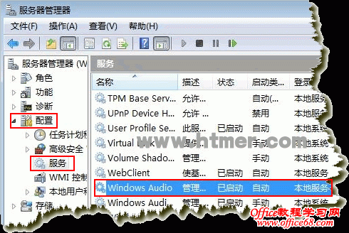 在Windows Server 2008中,默认情况下音频服务是被关闭的,我们在任务栏右下角可以看到小喇叭显示的是叉,点击小喇叭会提示音频服务没有开启,所以今天就教大家在Windows Server 2008中开启声音的方法。 1、在桌面上右击计算机→管理,打开服务器管理器,依次展开服务器管理器→配置→服务,在右边的窗口中找到“Windows Audio”服务,相关截图如下所示:
