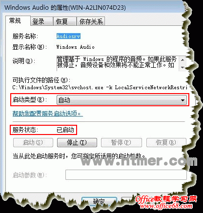 2、双击“Windows Audio”服务,在弹出的Windows Audio服务属性窗口中设置“启动类型”为“自动”,同时设置“服务状态”为“已启动”即可,相关截图如下所示: