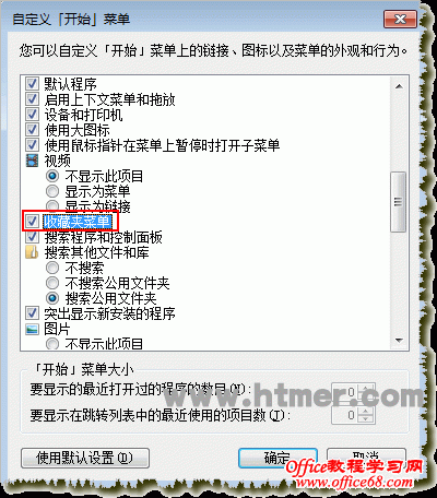 5、在出现的窗口中找到“收藏夹菜单”并勾选,好了之后点击确定按钮即可,相关截图如下所示: