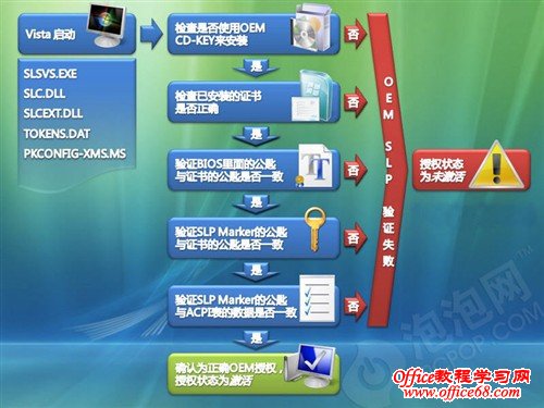 分步补充说明: 1、首先检测是密钥类型是否是OEM密钥。 2、检查OEM证书的有效性。 3、检查OEM公钥和BIOS公钥是否一致。 4、使用OEM公钥,对SLIC中Marker数字签名进行验证检查。 5、验证ACPI表中的OEMID、TABLE ID等是一致,Windows 7还需要检查Maker版本等信息是否正确。 6、以上全部OK转入激活状态置位,否则转入为未授权状态或WPA方式激活状态(在线激活或电话激活)。 |