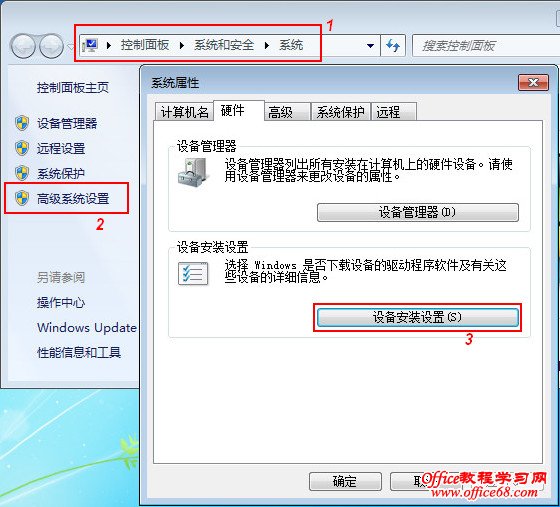 补充: 另外还可以通过以下方式打开上述窗口:依次打开控制面板——系统和安全——系统窗口中,点击左侧的高级系统设备,选择硬件选项卡,点击设备安装设置一样可以到达上图位置,如下图。