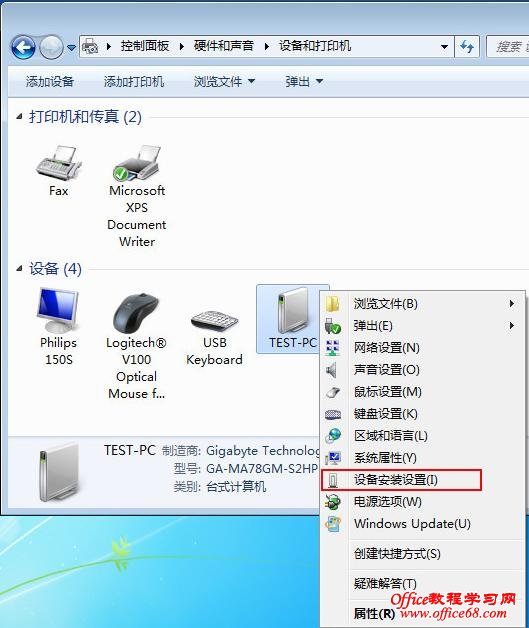 2、找到自己的计算机图标,进行设备安装设置 找到计算机图标并点击鼠标右键,在弹出菜单中选择设备安装设置,注意,这里的名字要选择正确,看图标对单机而言,像下面的立式图标就是指当前计算机,如果自己不确定,请参考下面的插图查找自己的计算机名。