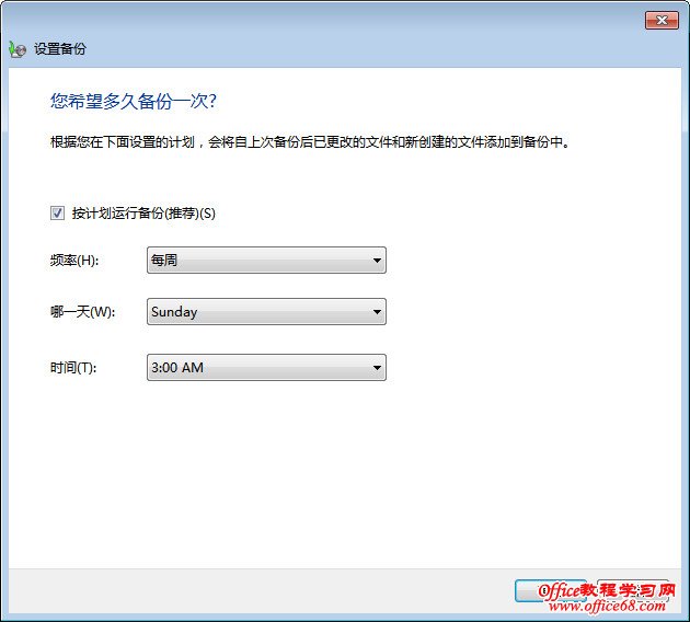 默认备份是按照每周进行的,可以通过上图中的更改计划配置自动备份的周期,可以设置是每天备份还是每周备份,具体到几点几点都可以,如下图: