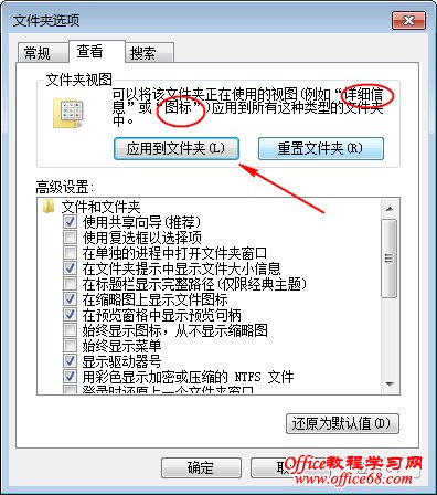 点击“查看”选项卡,如下图,点击应用到文件夹,(重置文件夹就是重置为Windows 7默认视图功能)