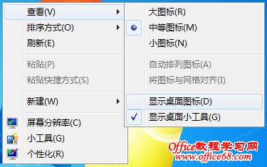 其它的图标,通过在桌面空白处,点击鼠标右键,选择查看,在弹出菜单中取消显示桌面图标即可全部隐藏掉。为了让桌面更美观一点,可以找个美女、风景等图片作为桌面背景,从此就只需要使用开始菜单就可以了。 |