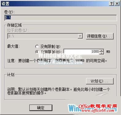 为了让卷影副本服务按照我们的需求进行工作,在正确地将目标共享资源的卷影副本服务启用成功后,我们还需要对其进行一番合适设置;在进行这种设置操作时,我们可以按照下面的步骤来进行: 首先按照前面的操作步骤打开“卷影副本”标签设置页面,选中已经启用了卷影副本服务的目标磁盘卷,再单击“设置”按钮,打开如图3所示的设置对话框,在该对话框中我们可以对存储区域参数、最大值参数、运行计划参数进行合适设置。