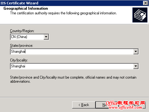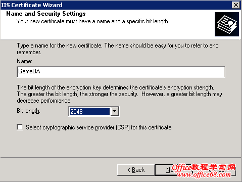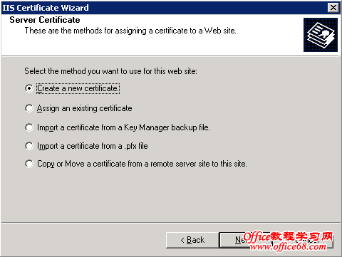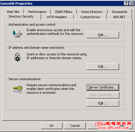 1. 在管理员工具Administrative Tools下,打开Internet Services Manager。 2. 鼠标右键点击你要加密的网站名,然后点击“属性”Properties。 3. 点击“目录安全性”Directory Security 。 4. 在“安全通信”Secure communications中点击“服务器证书”Server Certificate。(注意如果是第一次使用“编辑”Edit按钮将未被激活) 5. 选择“创建新证书” Create a new certificate