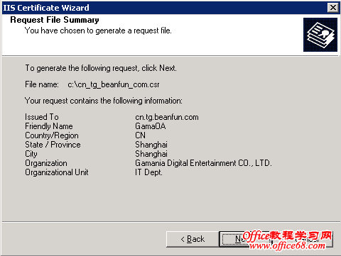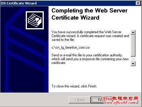 13.点击“Finish”退出IIS证书向导,CSR文件已经被生成好了。